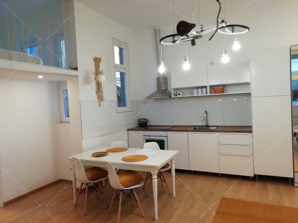 30 négyzetméteres stúdió apartman nyitott nappalival és konyhával, tetőtéri hálószobával, valamint ablakos fürdőszobával és WC-vel.