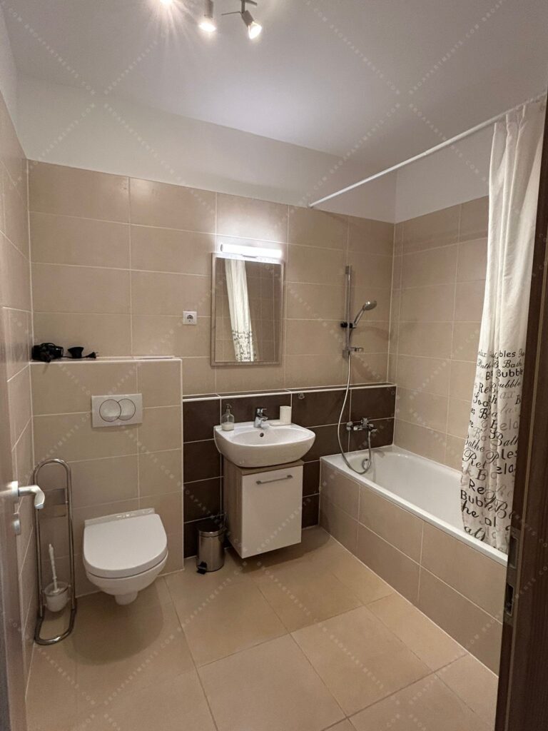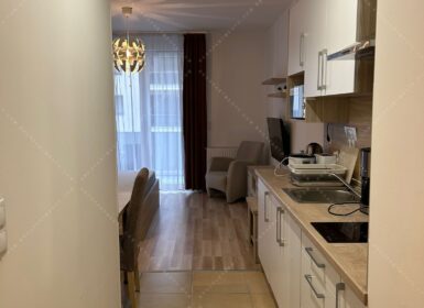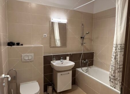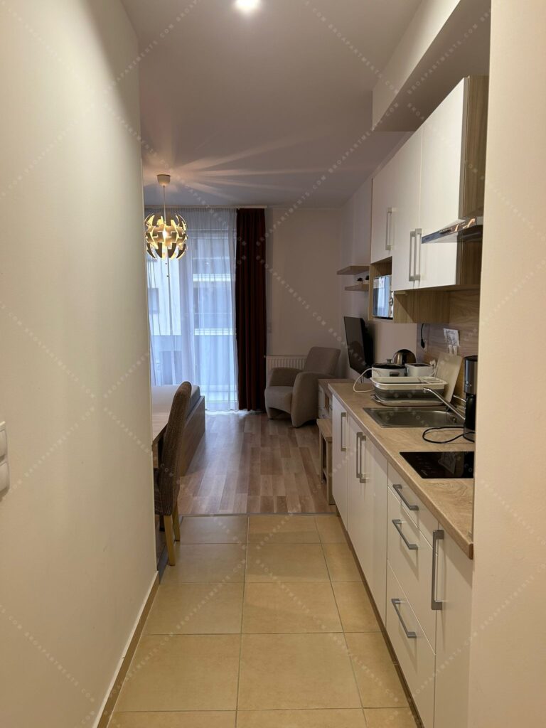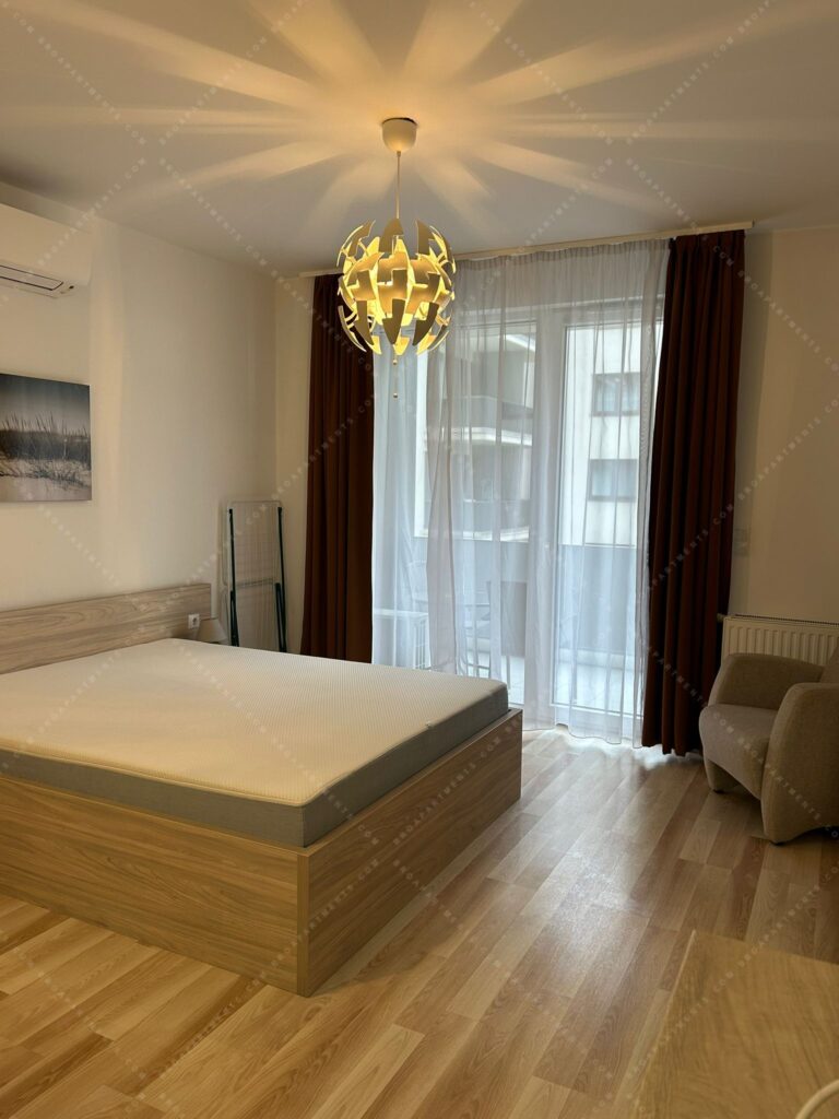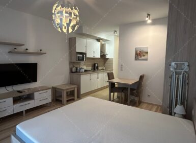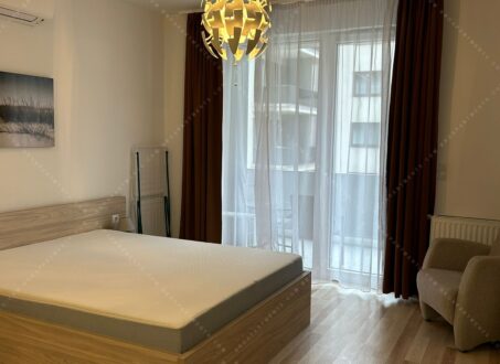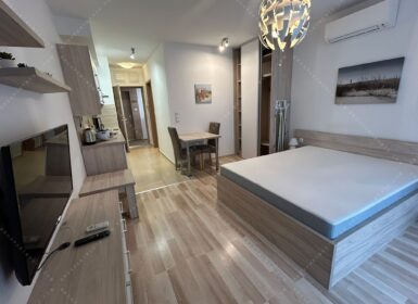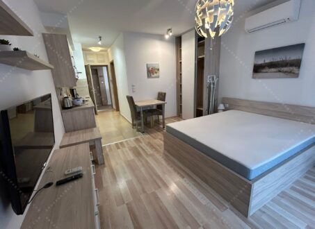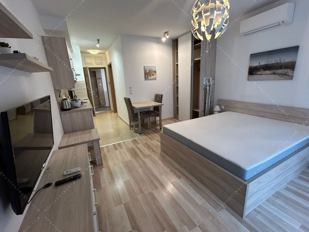 For rent on Corvin Promenade (Atrium Building): a 35 sqm studio apartment with a 7 sqm balcony, fully furnished, air-conditioned, and equipped with appliances. Located on the 4th floor of a modern building with elevator, available for immediate move-in.