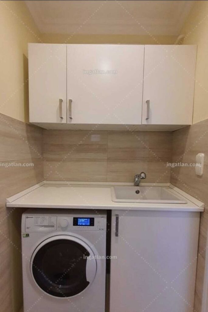The apartment includes an open-plan living room with an American-style kitchen, a comfortable bedroom, a luxury-renovated bathroom (with a small balcony), a separate toilet, a laundry room, and a practical walk-in wardrobe.